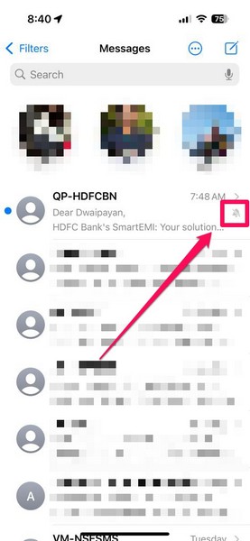2.Entre tus chats de iMessage,localizar las conversaciones silenciadasen la lista. te darás cuentaun icono de silencio(una campana tachada) junto a las conversaciones silenciadas en la lista.