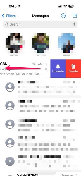 3.Ahora,desliza la conversación de iMessage silenciadadederecha a izquierdapara revelar los botones adicionales.