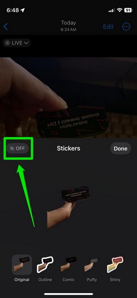 Otra razón común por la que podrías enfrentar el problema de que Live Stickers no funciona en tu iPhone en iOS 17 podría ser un simple error del usuario por tu parte. Verá que cuando crea una etiqueta en vivo usando una foto en vivo en la aplicación Fotos, la animación no está activada de forma predeterminada. Después de agregar la etiqueta a su lista, debe habilitar manualmente la opción Live para convertirla en una etiqueta en vivo.