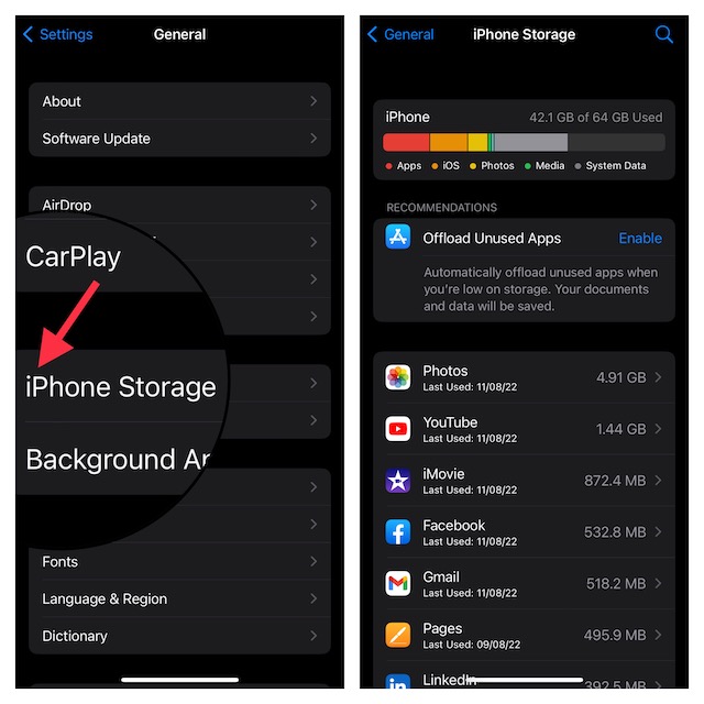 - Para tener una idea clara de lo que se debe limpiar, inicie la aplicación Configuración en su iPhone -> toque General -> Almacenamiento de iPhone.