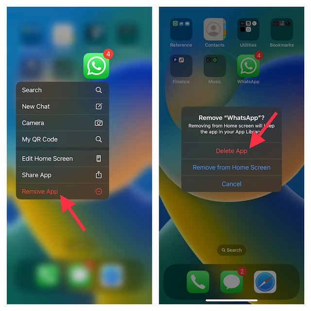 - Toque y mantenga presionado el ícono de la aplicación -> Eliminar aplicación -> Eliminar aplicación y confirme.