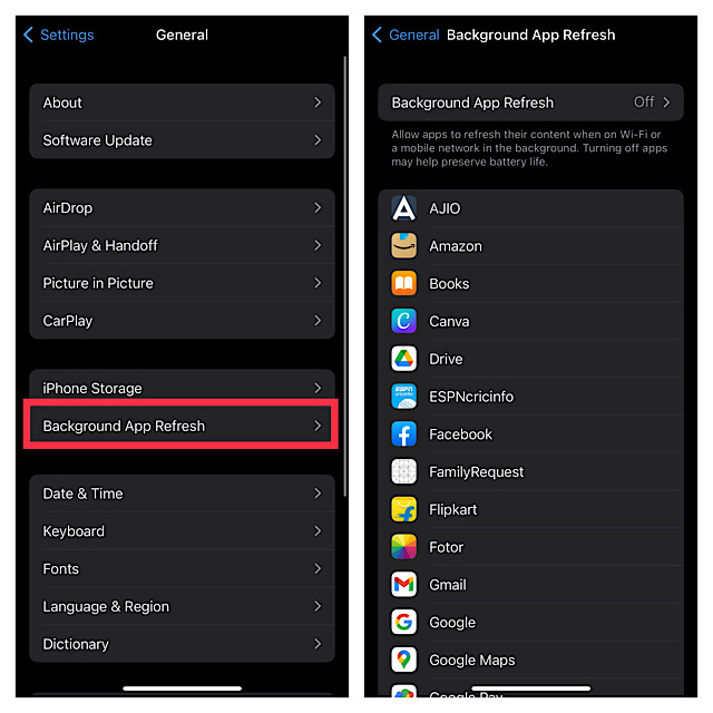 - Ir alAplicación de configuración -> General -> Actualización de la aplicación en segundo plano-> active la opción para actualizar la aplicación en segundo plano -> busque la aplicación y asegúrese de que se pueda actualizar en segundo plano.