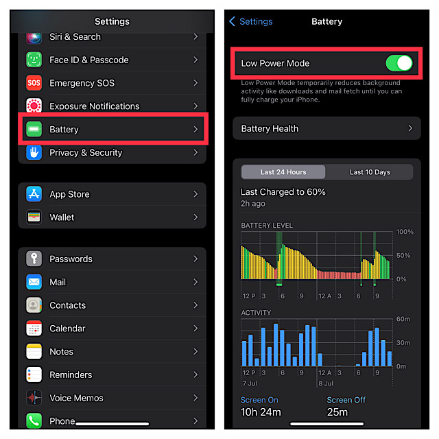 El modo de bajo consumo extiende la duración de la batería de su iPhone al desactivar temporalmente todas las actividades en segundo plano. Si ha activado este amplificador de energía, es posible que esté impidiendo que funcione la función Actividades en vivo.
