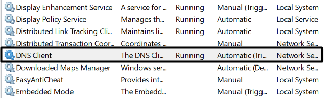 2.En elServiciosventana, busque elCliente DNSservicio y luego haga clic derecho en él para obtener un menú.