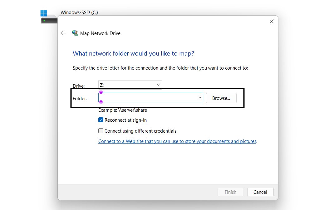 4.En elCarpeta:cuadro de texto, especifique la carpeta que desea conectar y luego continúe.