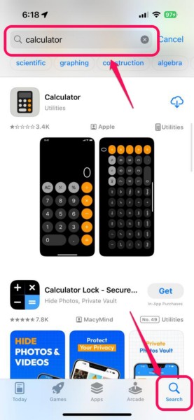 6.Ir alPestaña de búsquedaen la barra de navegación inferior yusa la barra de búsquedapara encontrar elAplicación de calculadora.