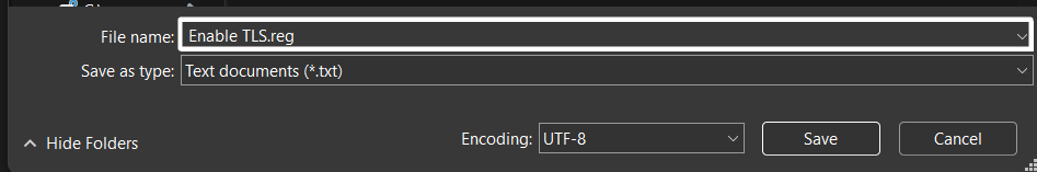 Windows Registry Editor Version 5.00[HKEY_LOCAL_MACHINESOFTWAREMicrosoftWindowsCurrentVersionInternet SettingsWinHttp] “DefaultSecureProtocols”=dword:00000a00[HKEY_LOCAL_MACHINESOFTWAREWow6432NodeMicrosoftWindowsCurrentVersionInternet SettingsWinHttp] “DefaultSecureProtocols”=dword:00000a00[HKEY_LOCAL_MACHINESYSTEMCurrentControlSetControlSecurityProvidersSCHANNELProtocolsTLS 1.1Client] “DisabledByDefault”=dword:00000000 “Enabled”=dword:00000001[HKEY_LOCAL_MACHINESYSTEMCurrentControlSetControlSecurityProvidersSCHANNELProtocolsTLS 1.2Client] “DisabledByDefault”=dword:00000000 “Enabled”=dword:00000001