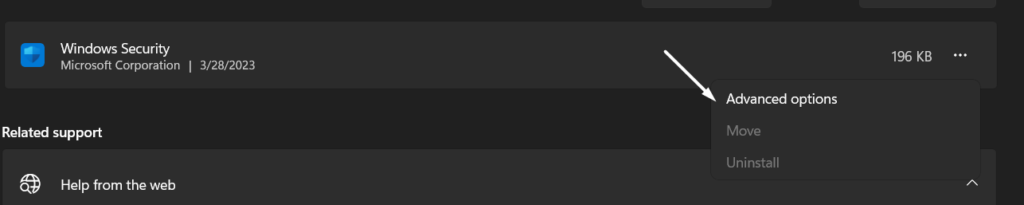 3.Hacer clic entres puntos (…)junto aSeguridad de Windowsy seleccione elOpciones avanzadasdesde el menú desplegable.
