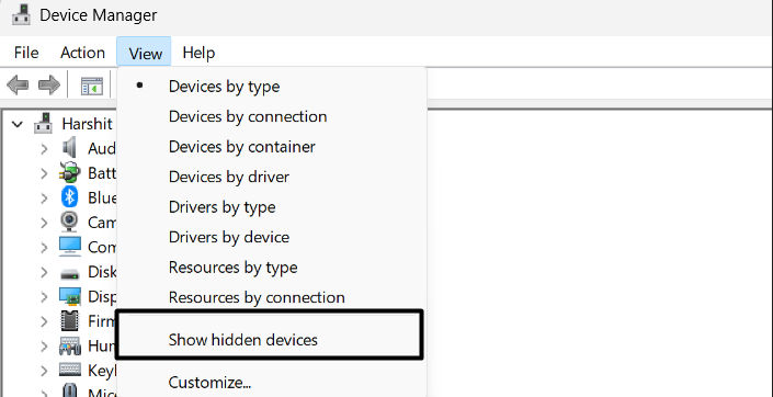 2.SeleccionarMostrar dispositivos ocultosen el menú desplegable para ver todos los controladores ocultos de Windows.