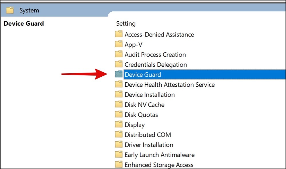 3.Haga doble clic en elSistemacarpeta y luego haga doble clic en elGuardia del dispositivocarpeta para abrirla.