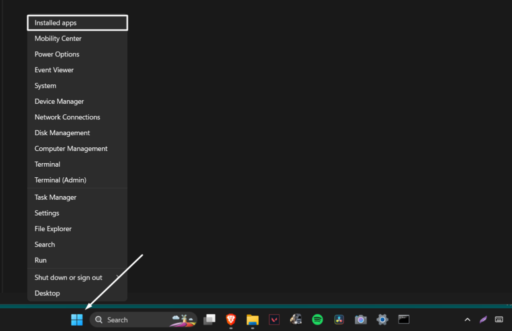 1.Haga clic derecho en ellogotipo de Windowsen la barra de tareas del sistema y seleccione elAplicaciones instaladasopción de él.
