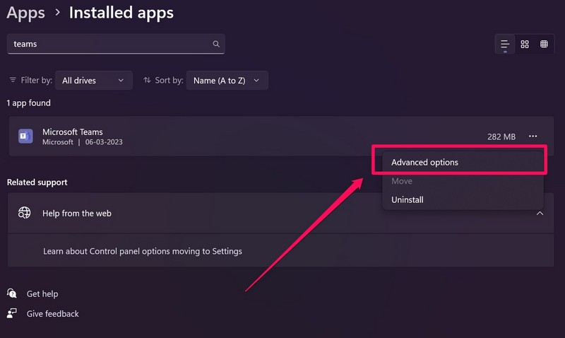 Si la actualización de su dispositivo Windows 11 no solucionó el problema del micrófono que no funciona en Teams, puede intentar reparar y/o restablecer la aplicación Teams. Siga los pasos a continuación para reparar primero la aplicación Microsoft Teams en su dispositivo. Si eso no resuelve el problema, puede seguir los pasos posteriores para restablecer la aplicación.
