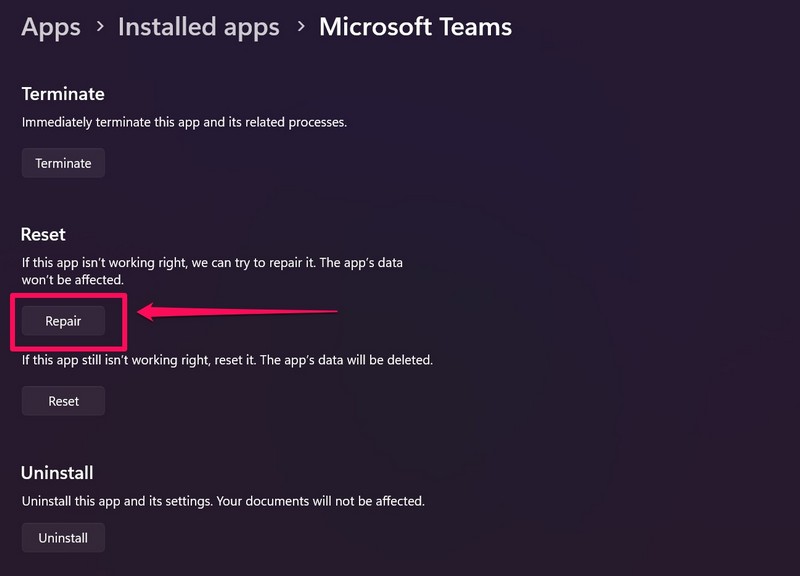 4. Reparar/restablecer Microsoft Teams en Windows 11