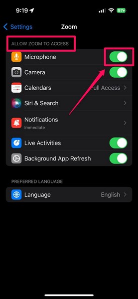 3.En la siguiente página,toca el interruptorpara elOpción de micrófonobajo elPermitir que Zoom accedasección para habilitarlo en su iPhone.