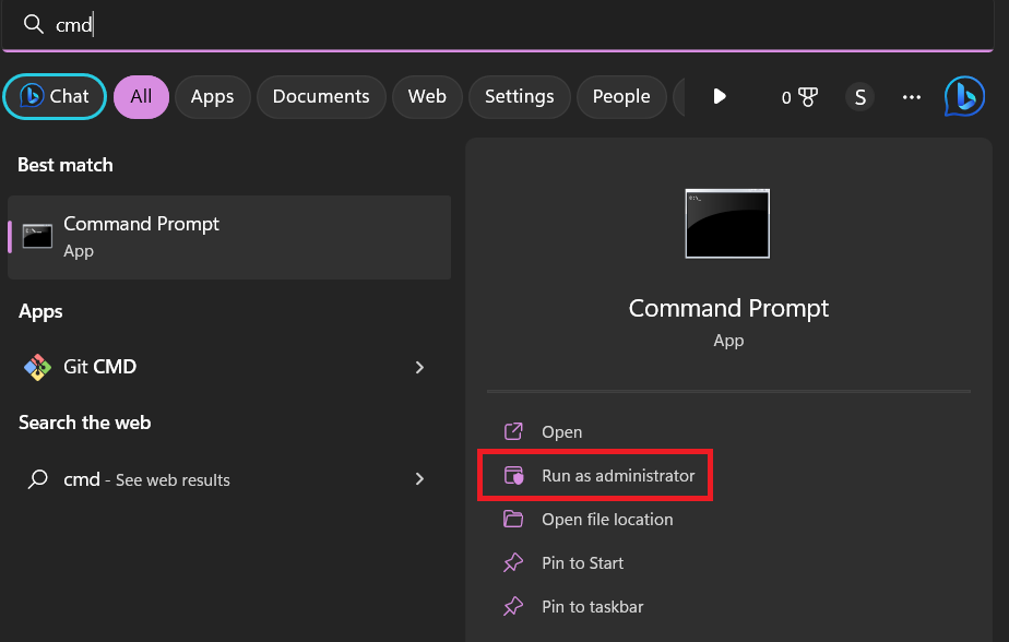 1.Abra la búsqueda de Windows, escribaCMD,y elige elEjecutar como administradoropción.