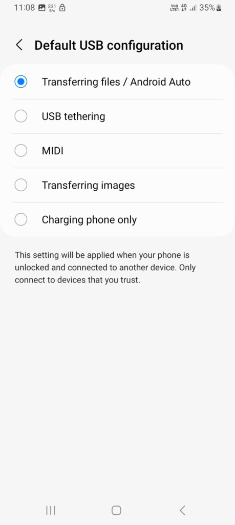 4.Cambiar la configuración predeterminada deCargando solo el teléfonoaTransferir archivos/Android Auto, y estás listo para comenzar.