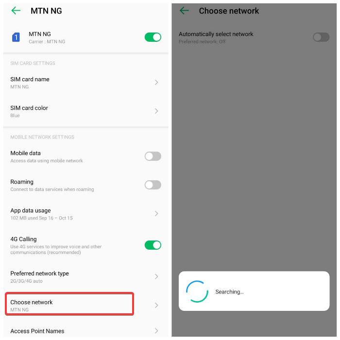 3.ApagarSeleccionar red automáticamentey espere a que se cargue su operador de red. Después de eso, seleccione su red y reinicie su teléfono.