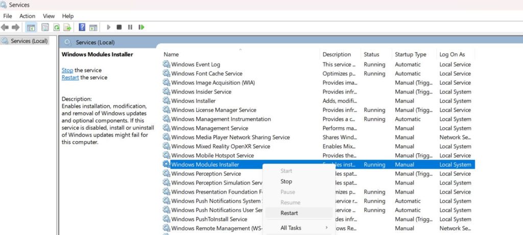 Paso 3:En la ventana Servicios, busque el servicio "Instalador de módulos de Windows".