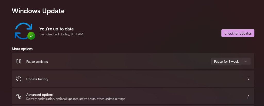 Paso 2:Presione el botón "Buscar actualizaciones" ubicado en la esquina superior derecha. Windows le notificará si hay una actualización disponible para su dispositivo.