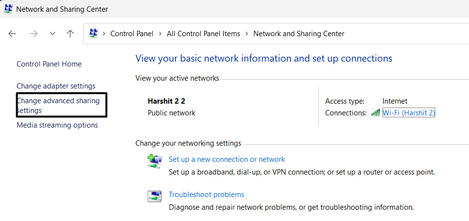 2.ElegirCentro de redes y recursos compartidosy luego seleccioneCambiar la configuración avanzada para compartir.