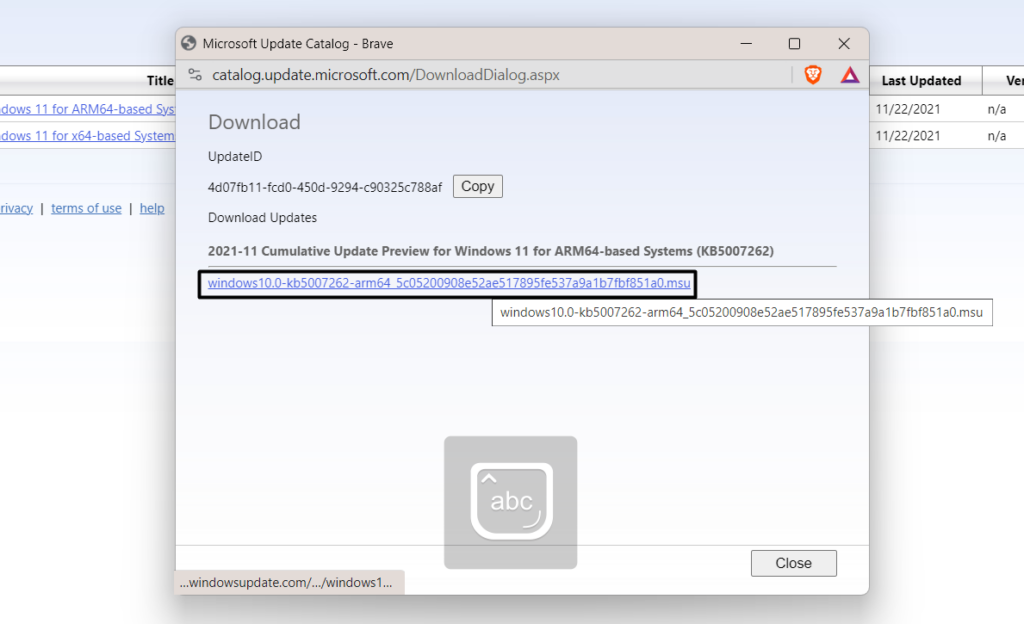 4.En la nueva ventana, copie elID de actualizaciónen su portapapeles haciendo clic en elCopiarbotón al lado.