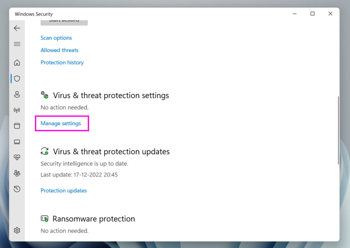 1.Inicie elProtección contra virus y amenazas aplicaciónen su PC y haga clic en elAdministrar configuracionesopción.