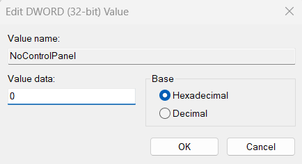 7.Ingresar0en elDatos de valor:campo, establezca elBaseopción ahexadecimal, y haga clicDE ACUERDOpara guardar los cambios.