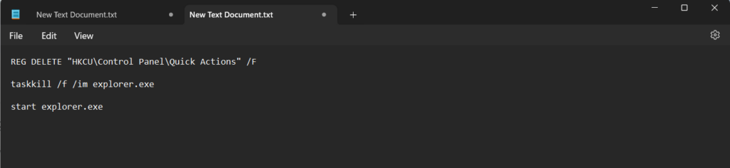 REG DELETE "HKCUControl PanelQuick Actions" /Ftaskkill /f /im explorer.exestart explorer.exe