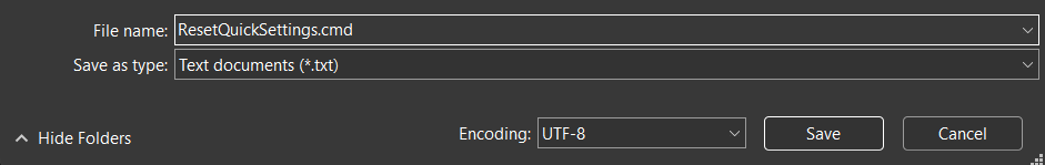 3.SeleccionarGuardar comodesde el menú y nombrar el documentoRestablecer QuickSettings.cmdy haga clic enAhorrar.