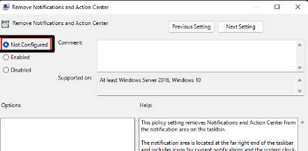3.Haga doble clic enEliminar notificaciones y centro de actividadesy seleccione elNo configuradobotón de opción.