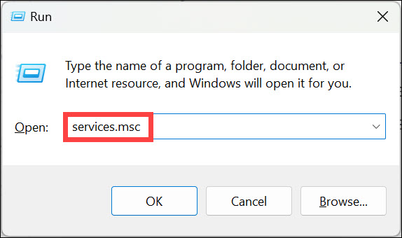 1.Abre elEjecutar utilidadcon elWindows + Rmétodo abreviado de teclado y escribaServicios.msc.