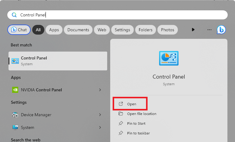 1.Abre elMenú Inicio, tipoPanel de controly haga clic enAbiertoopción.