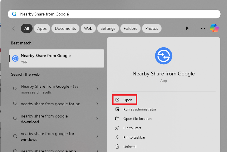 5.Busque Near Share en Google y haga clic enAbiertoopción.