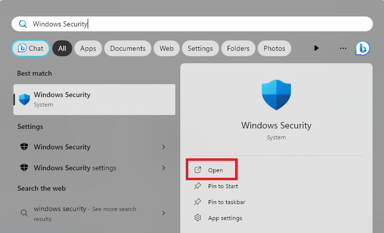 1.Abra el menú Inicio. TipoSeguridad de Windowsy haga clic enAbiertoopción.