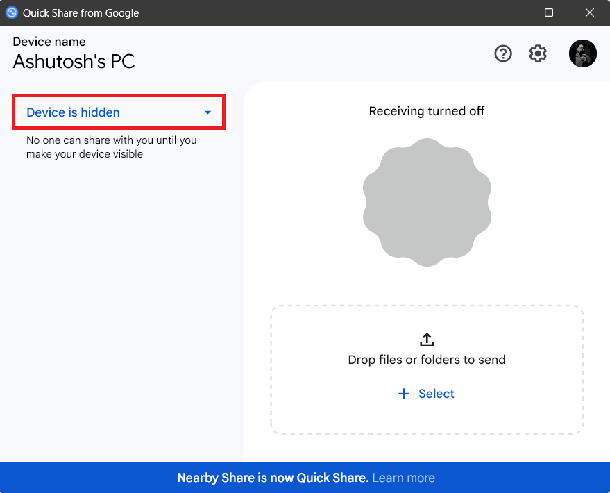 Una configuración de visibilidad incorrecta en la aplicación para PC Google Quick Share también puede causar conflictos en el proceso de conexión. Por ejemplo, cuando envía un archivo a su PC, pero la configuración de visibilidad está configurada enOculto, no aparecerá en la búsqueda.