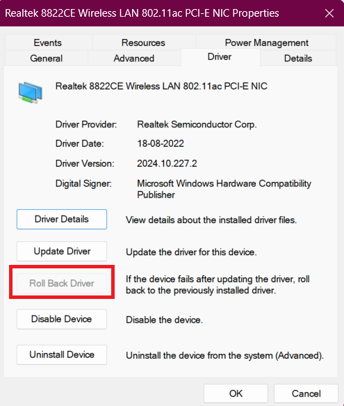 4.Si la actualización no solucionó el problema, abra las propiedades de los controladores y use elControlador de retrocesoopción.