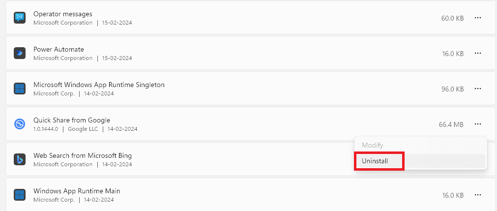 Si Windows Repair no puede resolver el problema, existe la posibilidad de que los archivos del sistema de la aplicación Quick Share de Google estén dañados o mal configurados. Ahora, para reparar los archivos del sistema, la mejor opción que tenemos es reinstalar la aplicación, ya que reemplazará los archivos antiguos por otros nuevos. Siga estos pasos para reinstalar Quick Share de Google en Windows 11:
