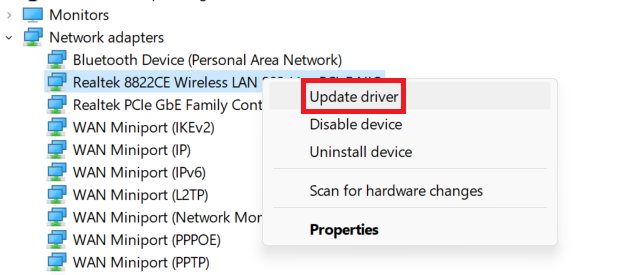 3.Después de actualizar el controlador Bluetooth, expanda la lista deAdaptadores de red. Luego haga clic derecho en el adaptador Wi-Fi que está usando y haga clic en elActualizar controladoropción.
