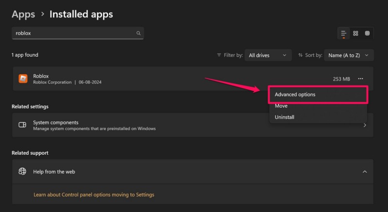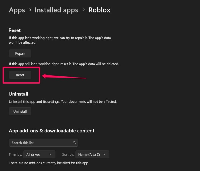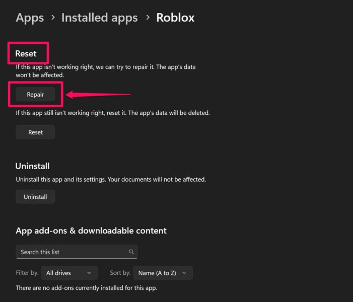 5. Restablecer/reparar la aplicación Roblox en su PC o computadora portátil con Windows 11