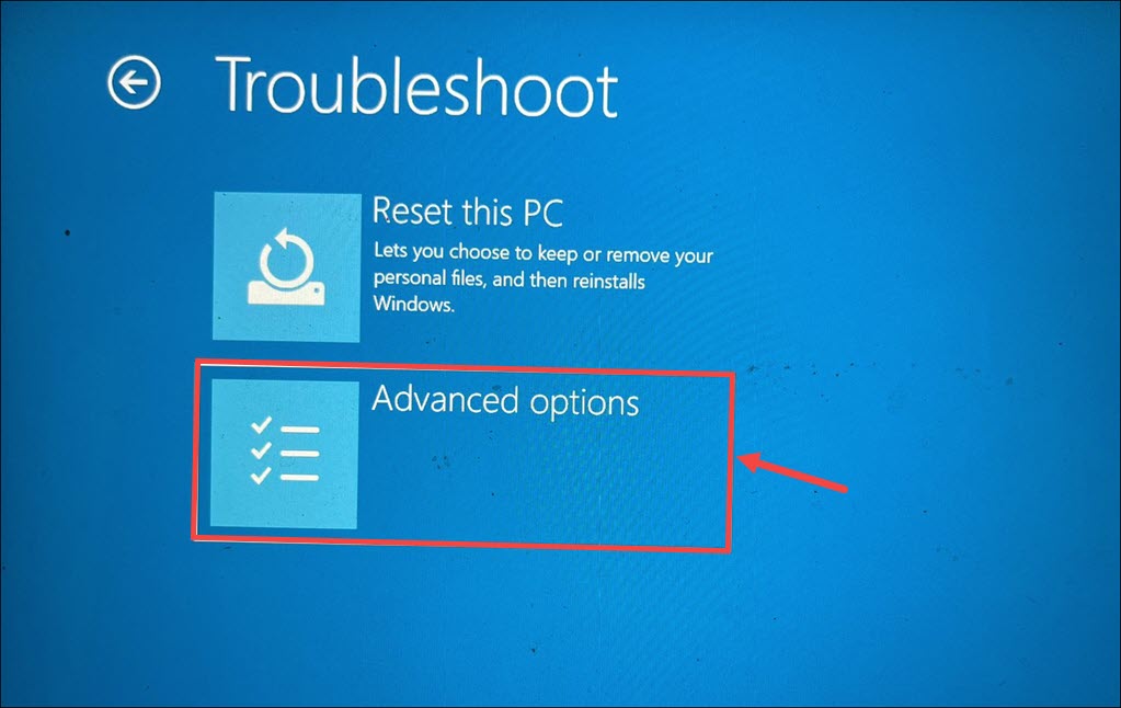 4.Seleccione elSolucionar problemasopción y luego haga clicOpciones avanzadasde las opciones dadas.