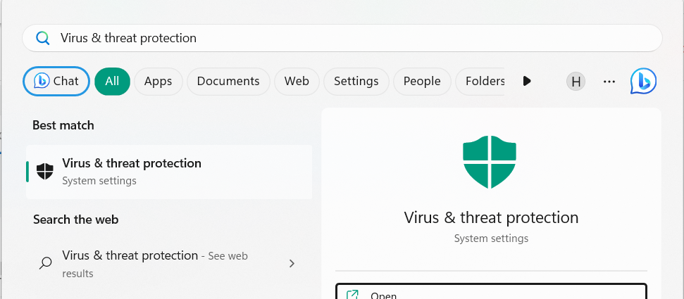 1.Presione elclave de Windowspara abrir elCuadro de búsqueda de Windowsy escribeProtección contra virus y amenazasen ello.