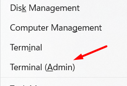 1.Primero, haga clic derecho en elÍcono del logotipo de Windowsen la barra de tareas y seleccione elTerminal (administrador)opción del menú.