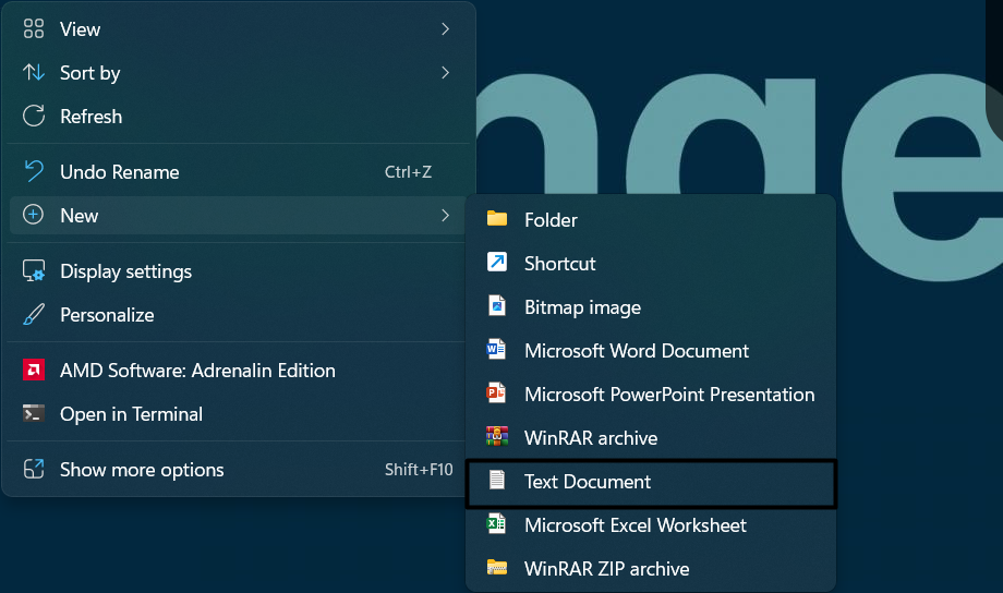 1.Primero, haga clic derecho en su escritorio, coloque la flecha sobreNuevo, y luego seleccione elDocumento de textoopción de él.