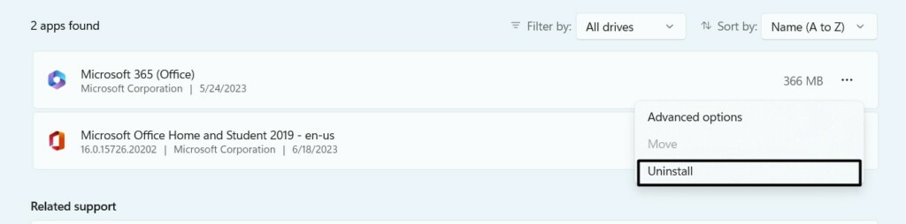 3.Haga clic entres puntos (…)junto a la aplicación y, en el menú desplegable, seleccione la opciónDesinstalaropción.