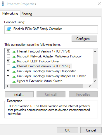 Paso 7:Para que los cambios sean permanentes, desmarque la casilla de verificación TCP/IPv6 y presione Aceptar.