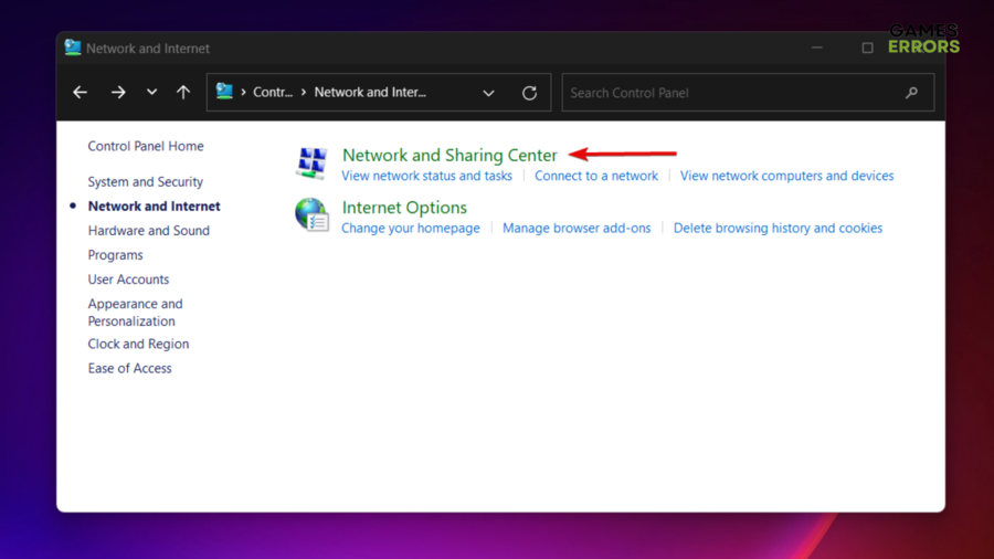 Paso 3:Haga clic en el módulo Redes e Internet, seguido del botón Centro de redes y recursos compartidos.