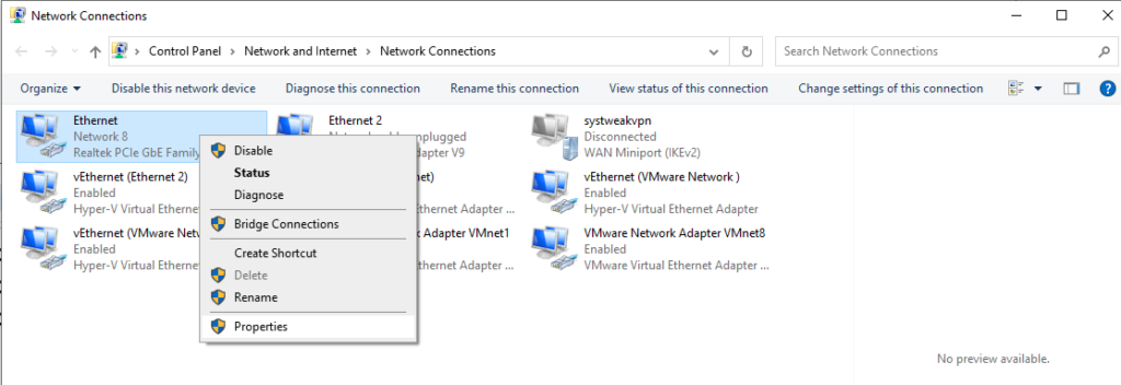 Paso 5:Seleccione Propiedades haciendo clic derecho en su conexión de red (Ethernet/Wi-Fi).
