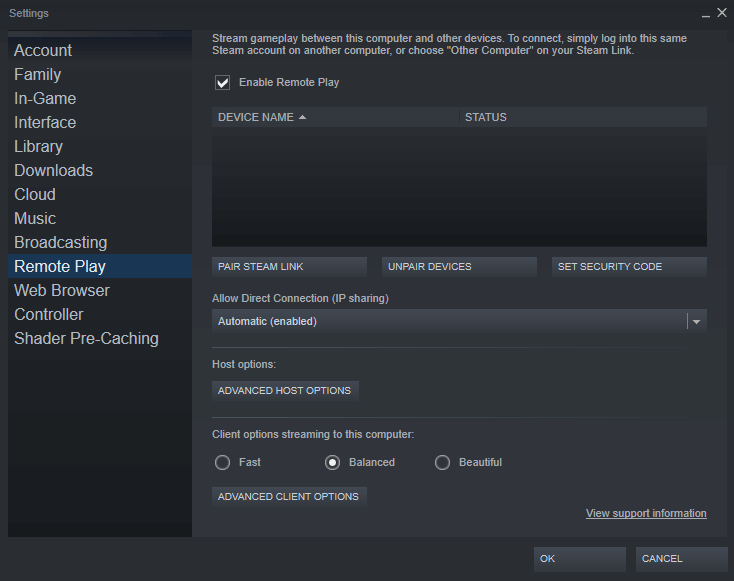 Se puede acceder a la función Remote Play en Steam a través de su Configuración. Intente deshabilitar y volver a habilitar el Uso a distancia en Steam para resolver cualquier problema momentáneo con la conexión. Para desactivar la función: