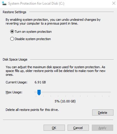 Si Restaurar sistema aún no funciona correctamente, considere modificar la asignación de espacio en el disco duro. Recomendamos asignar no menos de 4 GB. Veamos cómo le está yendo a su asignación de Restaurar sistema.