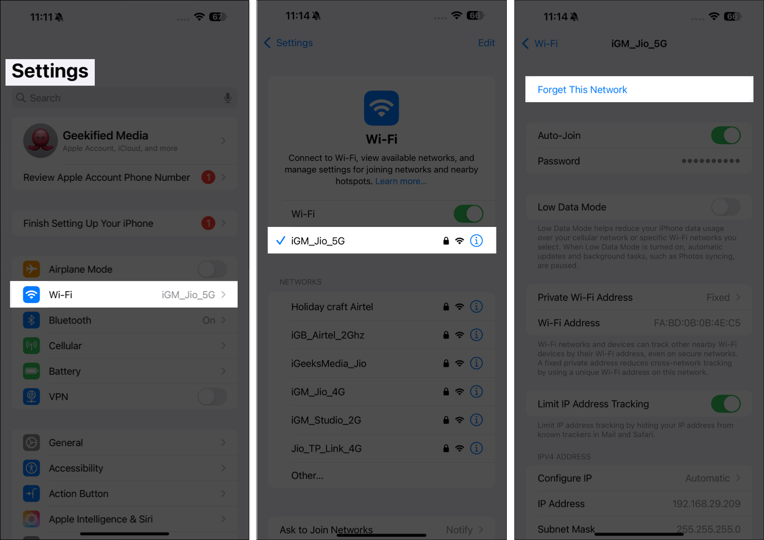 Verifique que su iPhone esté conectado a una red Wi-Fi confiable. Puede utilizar un medidor de velocidad de Internet para medir la velocidad de su red. Si muestra una conexión lenta, vaya aAjustes→wifi, toque su red conectada y seleccioneOlvídate de esta red. Luego, vuelva a conectarse a él.